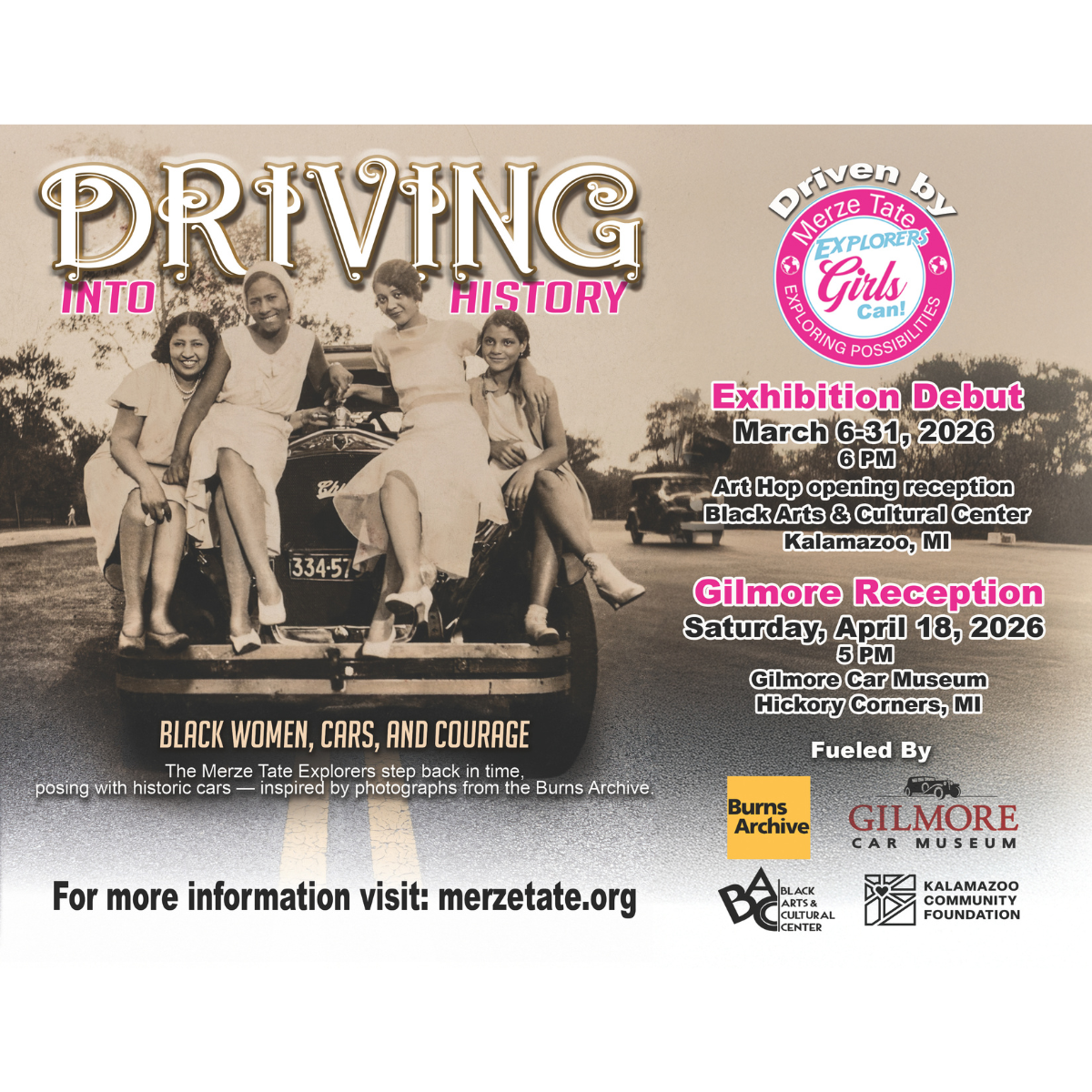 The Merze Tate Explorers step back in time, posing with historic cars – inspired by photographs from the Burns Archive.